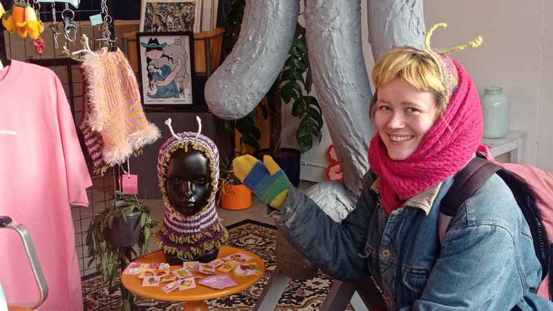 Im Verkaufsladen der Galerie Kett hängen mehrere Exemplare von Maris Strickmützen zum Verkauf, die man an den Fühlerantennen erkennt, die dich je nach Laune zur Biene oder zur Schnecke machen können.
